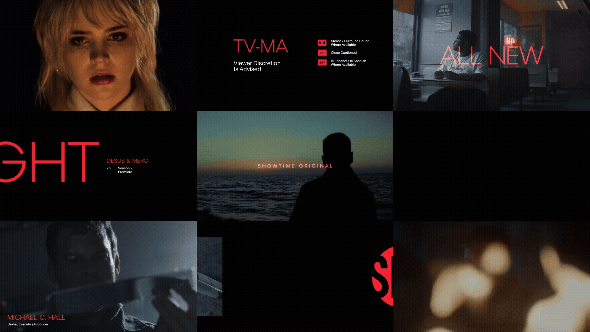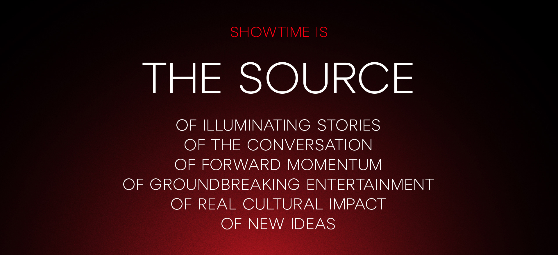 To add more tools to the toolbox, we developed a graphic device called the SLIPSTREAM – a series of shapes, born directly from the letterforms of the Showtime logo, that share some DNA with film strips and library carousels. It let us re-frame and shift focus from the portfolio down into a single show, character or moment. It became a graphic element to use as a framework for key art, employing the red bar to hint at a deeper library of content, just out of frame, waiting to be discovered.