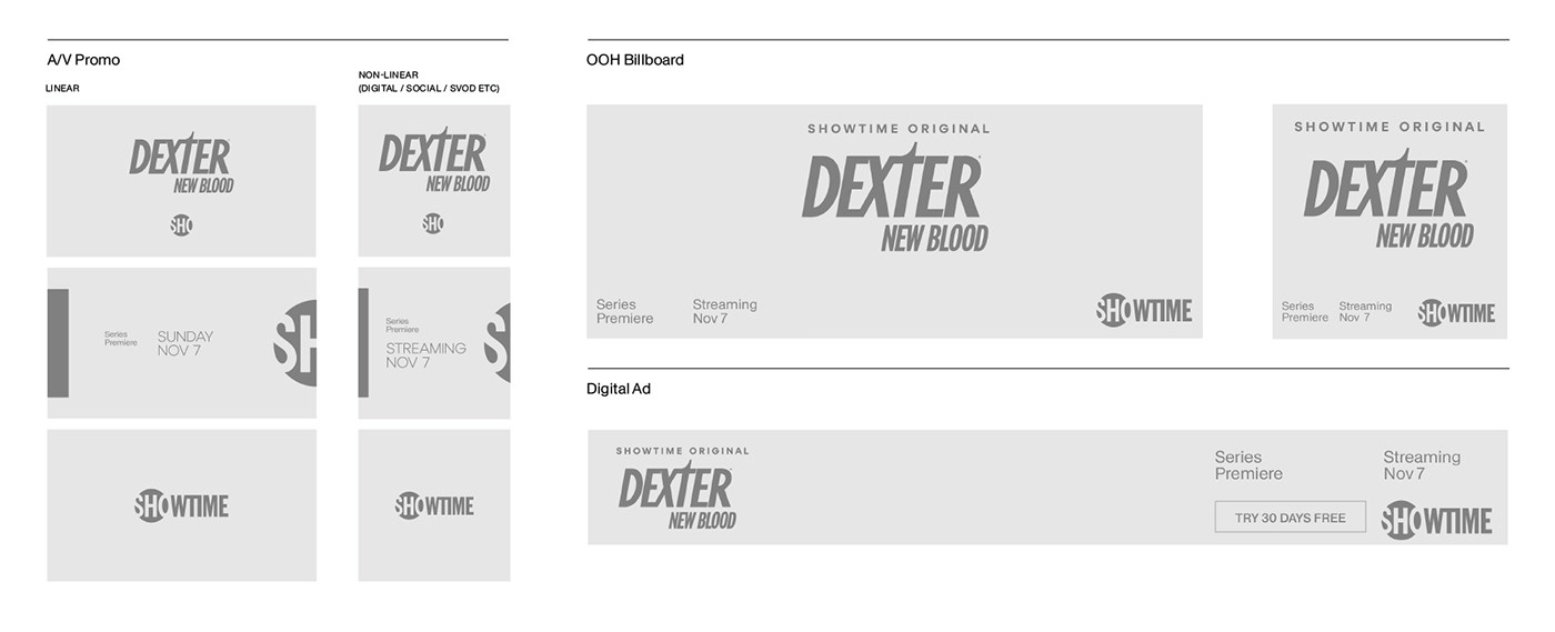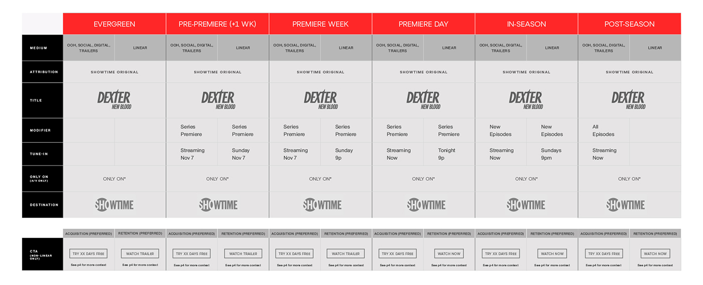 I did a full audit of their current brand messaging, across all touchpoints – with the ultimate goal being less variables, more consistency and more clarity. This yielded an entire deck of these hyper-specific messaging matrices, which provided strict guidelines for messaging over the entire promotional life cycle of a show title. But not all content is alike. There is very specific language for a brand new series VS a returning series VS a one-off event. Each type of content needed its own Matrix, and its own set of wireframes assets